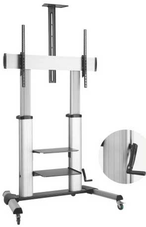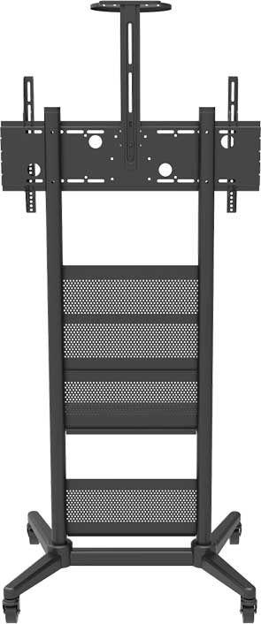 Wize MH100A – мобильная стойка для широкоформатных и интерактивных панелей диагональю от 60 до 100+ дюймов и весом до 100 кг. Изделие имеет функциональный дизайн. Крепкое и надежное основание обеспечивает повышенную устойчивость. Сверхпрочные колесики оснащены функцией блокировки и предупреждают случайное перемещение. С помощью кривошипной рукоятки можно без усилий регулировать высоту дисплея в пределах 400 мм для достижения оптимальной высоты обзора, а плавный наклон обеспечит оптимальный комфорт при просмотре. Стойка оснащена 3 полками – одной сверху для видеокамеры и двумя снизу – для различных аксессуаров для презентаций. Все полки регулируются по высоте и выдерживают нагрузку до 5 кг.