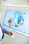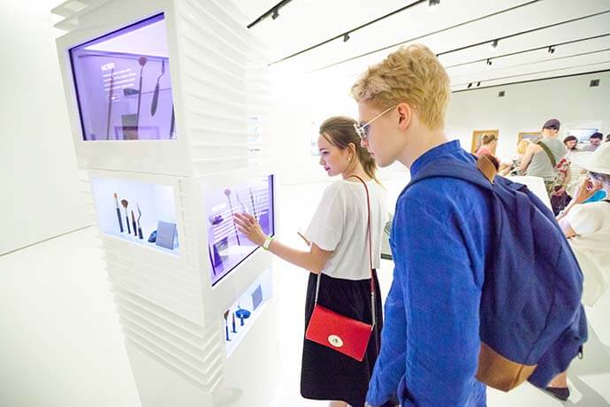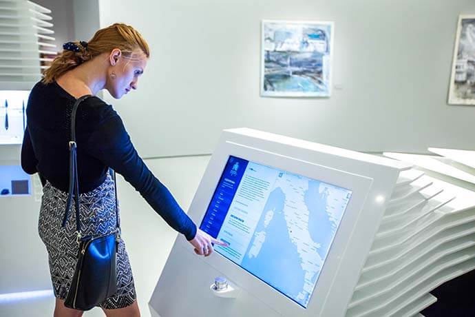 Сенсорные прозрачные экраны диагональю 27 дюймов, внутри которых расположены макеты. Макеты были специально изготовлены под пространство экрана. Использование макетов потребовало увеличения яркости подсветки внутренней части экрана, чтобы улучшить читаемость текстов.