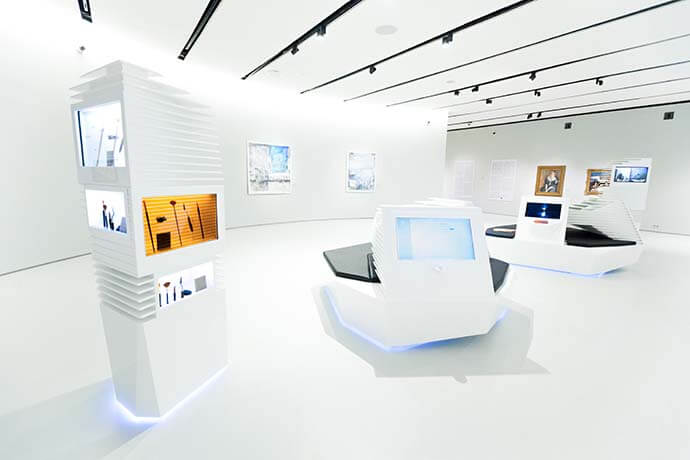 Единое визуальное решение для инсталляций было разработано на основе фирменного стиля музея, который ранее нашел отражение в архитектуре здания, в логотипе и элементах навигации музея, различных промоматериалах. Отличительной чертой инсталляций стала их динамичная форма, «ребра», продолжающие стилистику, заданную в логотипе, белый искусственный камень, выбранный в качестве материала для корпусов. На первый взгляд невесомые, «летящие» инсталляции представляют собой технически сложные мобильные конструкции, в которых использован нехарактерный для российского рынка набор оборудования: сенсорные прозрачные экраны, интерактивные голографические дисплеи, профессиональные мультитач-панели, инсталляционные компьютеры, физические манипуляторы, специально разработанная система детекции прикосновений к объектам.