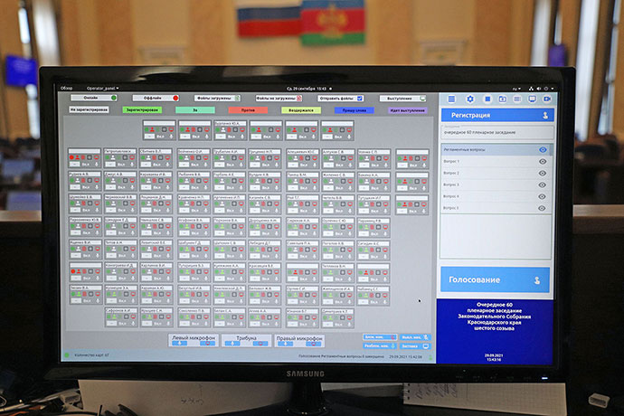 В зале установили конференц-систему Vissonic, включающую 73 пульта делегатов VIS-DCD-T, один пульт председателя VIS-DCC-T и центральный блок VIS-DCP2000-D. Пять делегатских пультов и пульт председателя для главы Заксобрания были размещены в президиуме. Конференц-система интегрирована с интерактивным решением АИС «Голосование» от ООО Компания «Сервис ТВ – Инфо».
